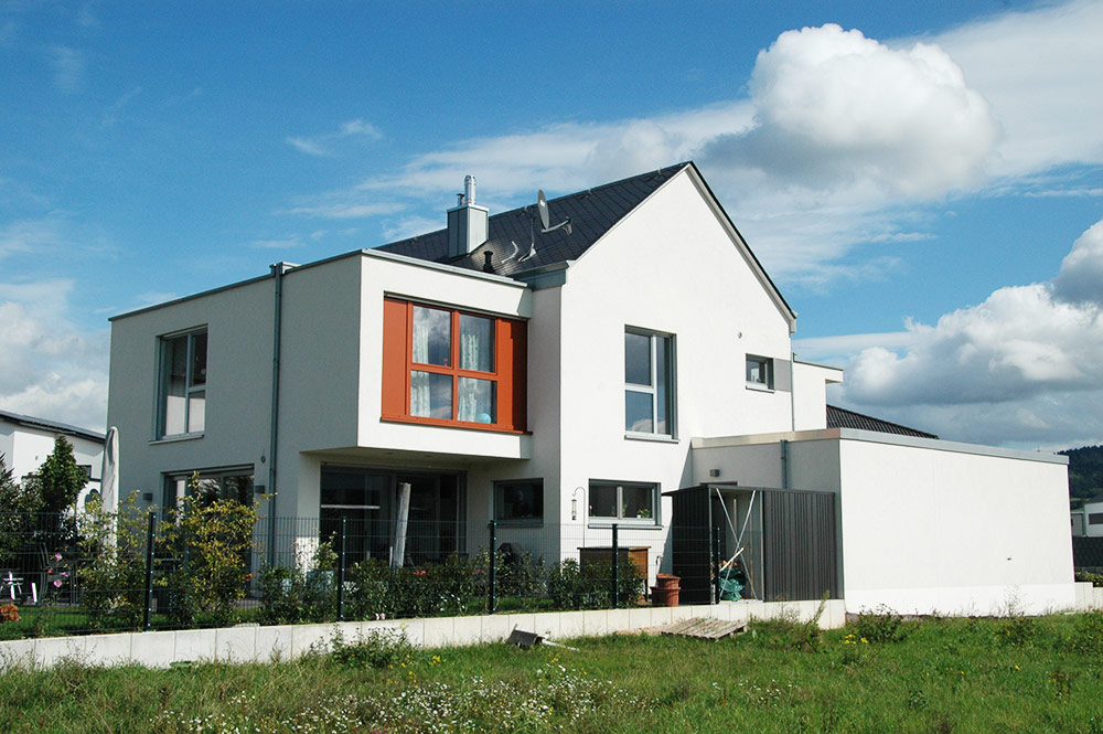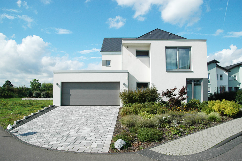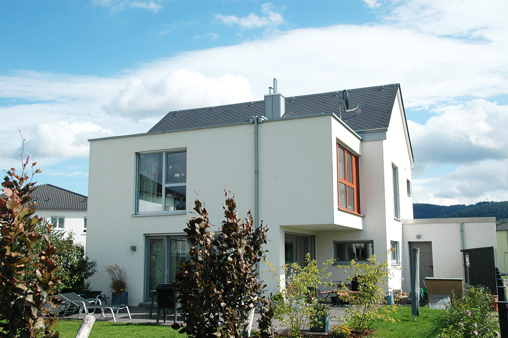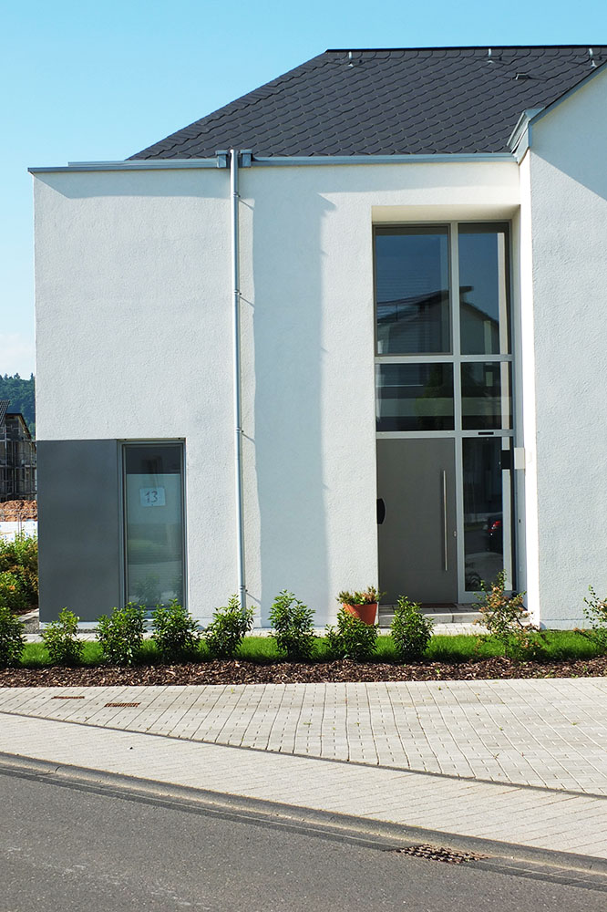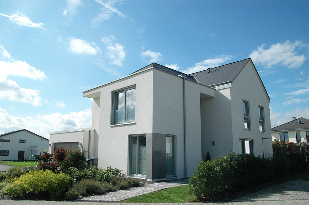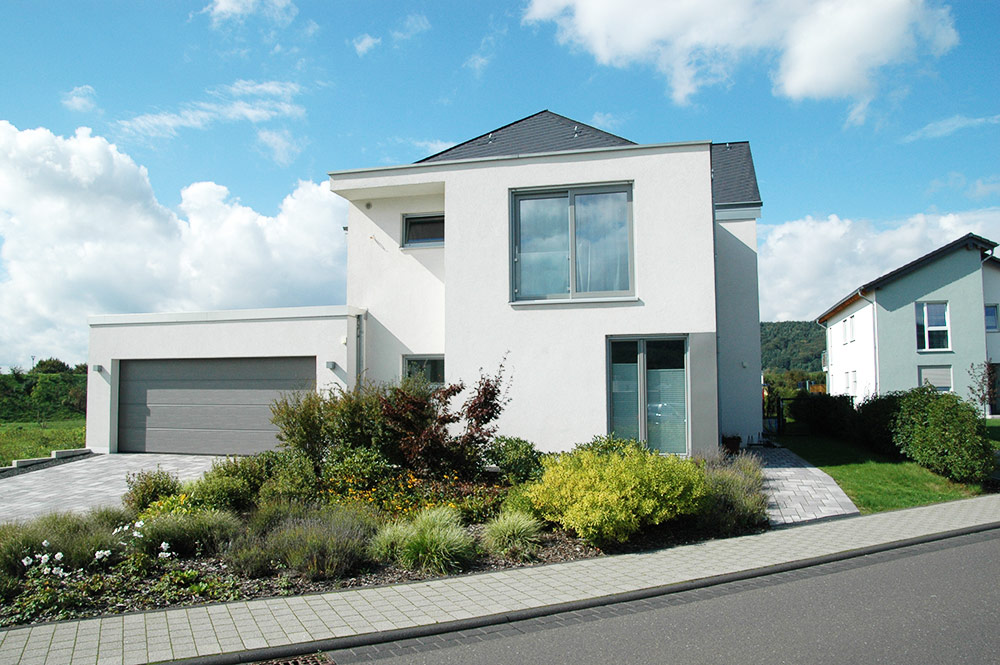 Ein 235qm Einfamilienhaus mit 4 Schlafzimmern auf einem Eckgrundstück in Schweich. Hierbei entwickelt sich das Grundstück in die Tiefe. Dies ist oft üblich für Zeilenbebauung, hier um das Bebauungsgrundstück für den Grundriss optimal zu nutzen.